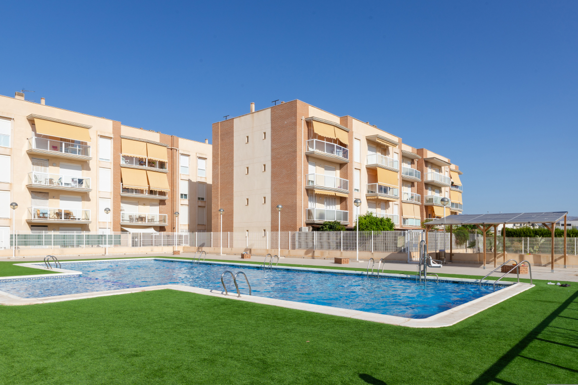 Vivienda con piscina comunitaria en la urbanización el Rubial, nueva zona de expansión de Águilas. Diseño moderno y de concepto abierto, tiene una superficie construida de 85 m2, distribuida en un luminoso salón-cocina, dos acogedores dormitorios y dos baños (ver planos) y terraza con vistas despejadas. Además dispone de cuatro armarios empotrados que garantiza una gran capacidad de almacenamiento. Vivienda totalmente reformada lista para vivir, con unas excelentes calidades, carpintería exterior de aluminio marca CORTIZO, con doble acristalamiento, puerta interiores de roble, suelo de tarima y pintura lisa, cocina lacada con encimera de madera. Muy luminoso ya que todas las estancias dan al exterior, sin patios interiores, orientada al Oeste y con vistas despejadas al parque de las Lomas. Forma parte de un complejo urbanístico provisto de parque infantil, jardines y piscina. La vivienda incluye plaza de garaje y trastero.